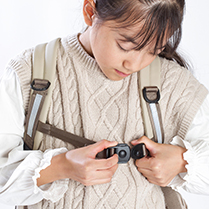 実際に背負ってみて、フィット感や動きやすさを確かめてください。胸バックルは手や洋服をはさまない特別仕様。お子さん自身で装着できるかもチェックポイントです。